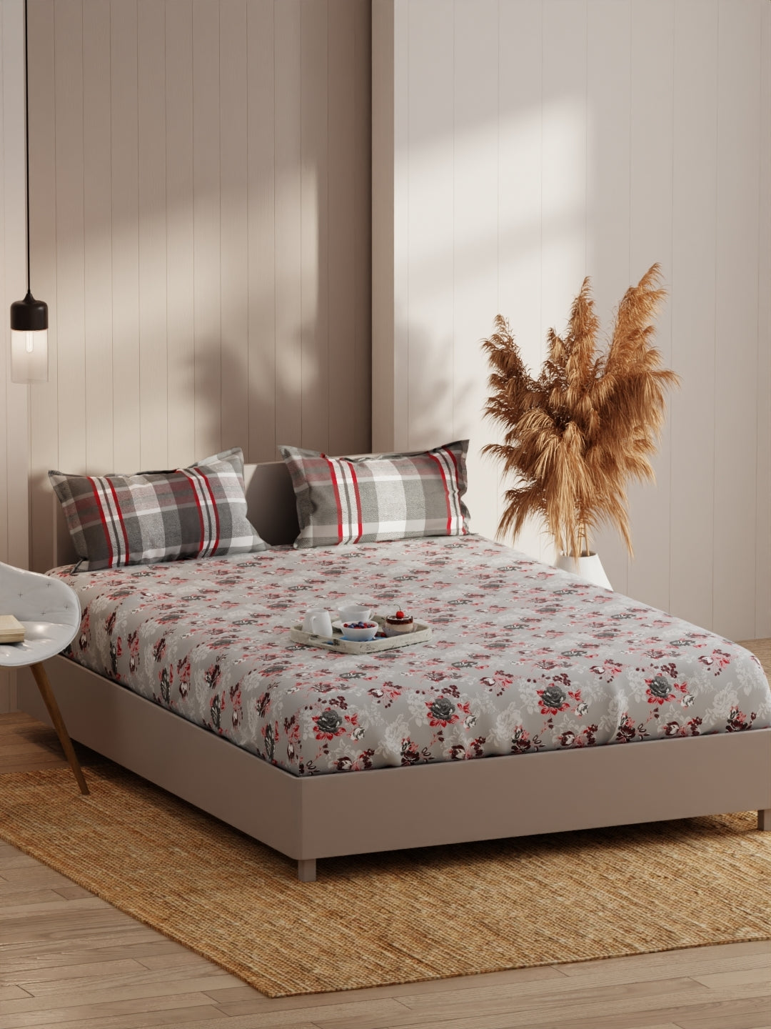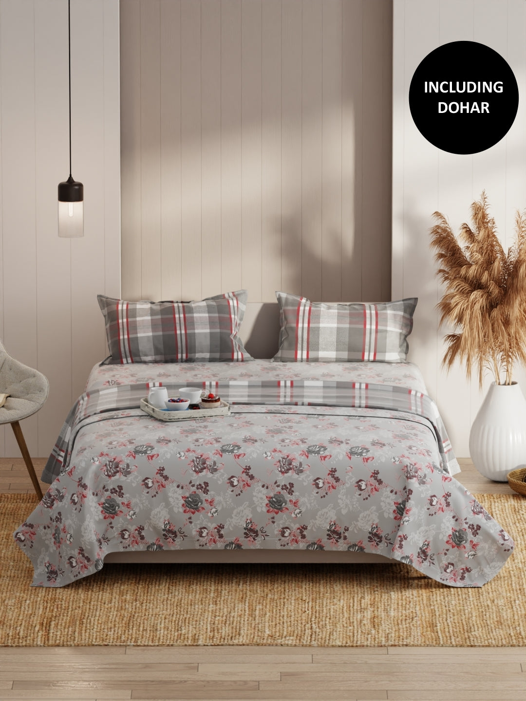 this king size bed-in-bag set comes with one double dohar, one double bedsheet and two pillow cover. it features a heavy-duty micro fabric for pleasant sleep. the comforter is filled with silken-micro fiber, and is suited for a.c. room. the fabric has special cotton-feel soft finish. it is easily machine washable.