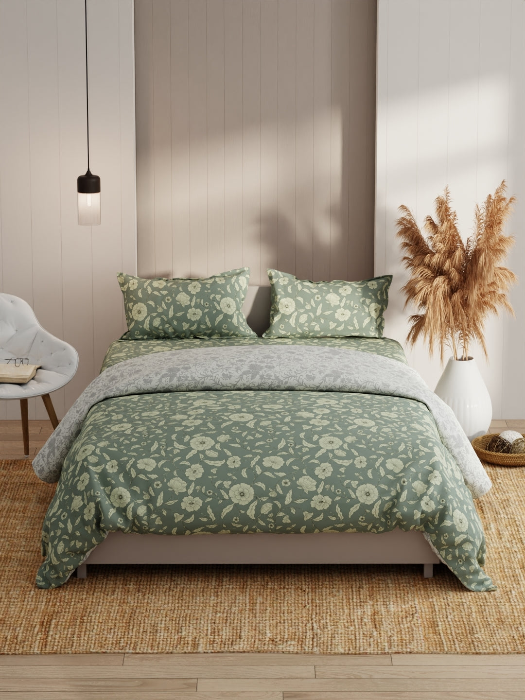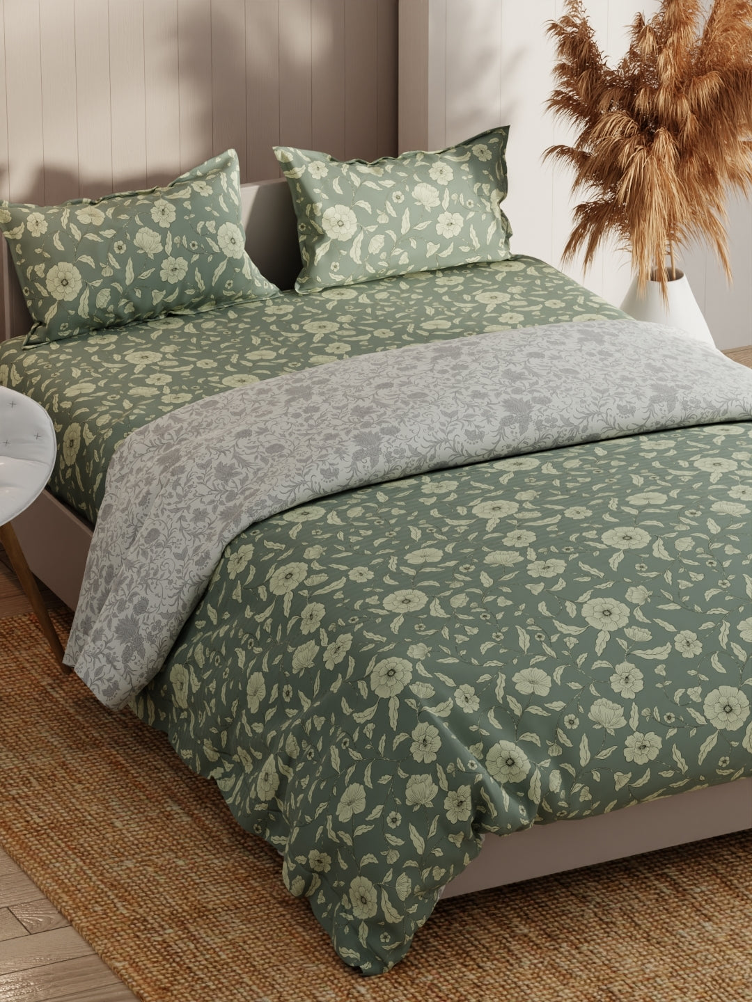 This king-size bed-in-bag set comes with one double dohar, one double bedsheet, and two pillow covers. It features a heavy-duty micro fabric for pleasant sleep. The comforter is filled with silken microfiber and is suited for an A/C room. The fabric has a special cotton-feel soft finish. It is easily machine washable.
