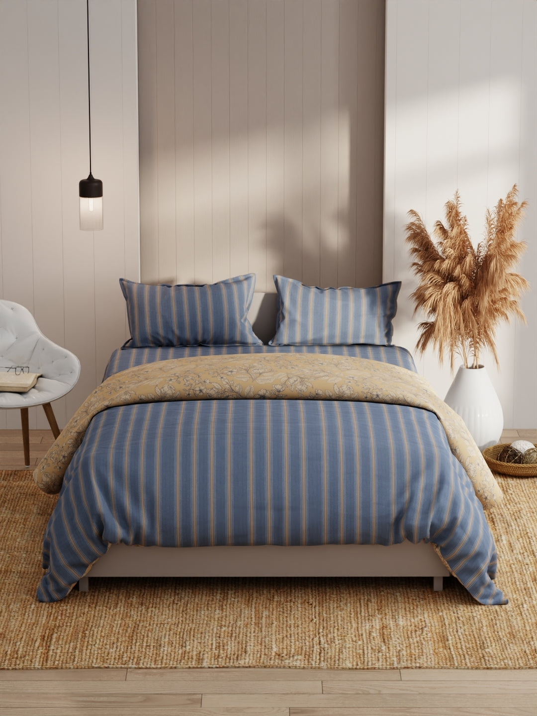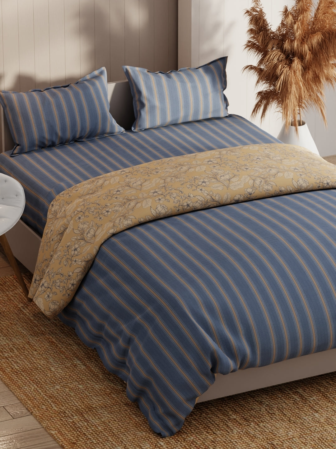 This king-size bed-in-bag set comes with one double dohar, one double bedsheet, and two pillow covers. It features a heavy-duty micro fabric for pleasant sleep. The comforter is filled with silken microfiber and is suited for an A/C room. The fabric has a special cotton-feel soft finish. It is easily machine washable.