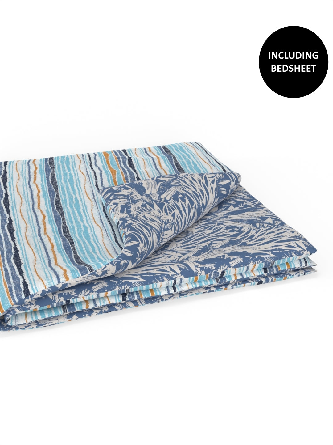 this king size bed-in-bag set comes with one double dohar, one double bedsheet and two pillow cover. it features a heavy-duty micro fabric for pleasant sleep. the comforter is filled with silken-micro fiber, and is suited for a.c. room. the fabric has special cotton-feel soft finish. it is easily machine washable.