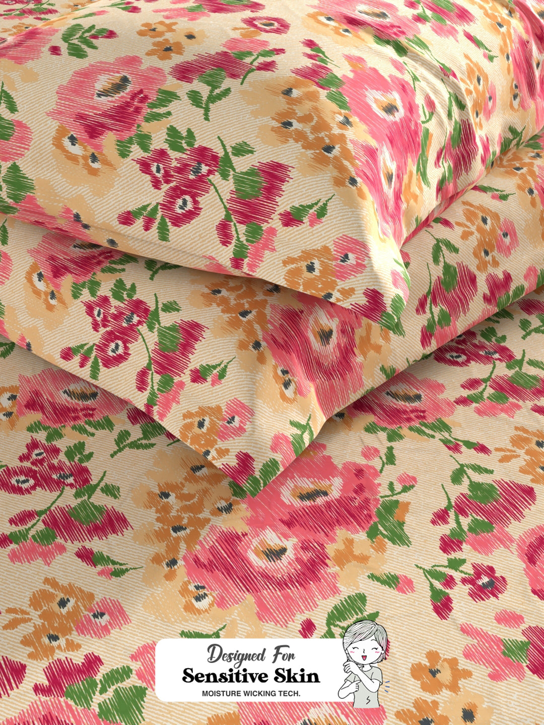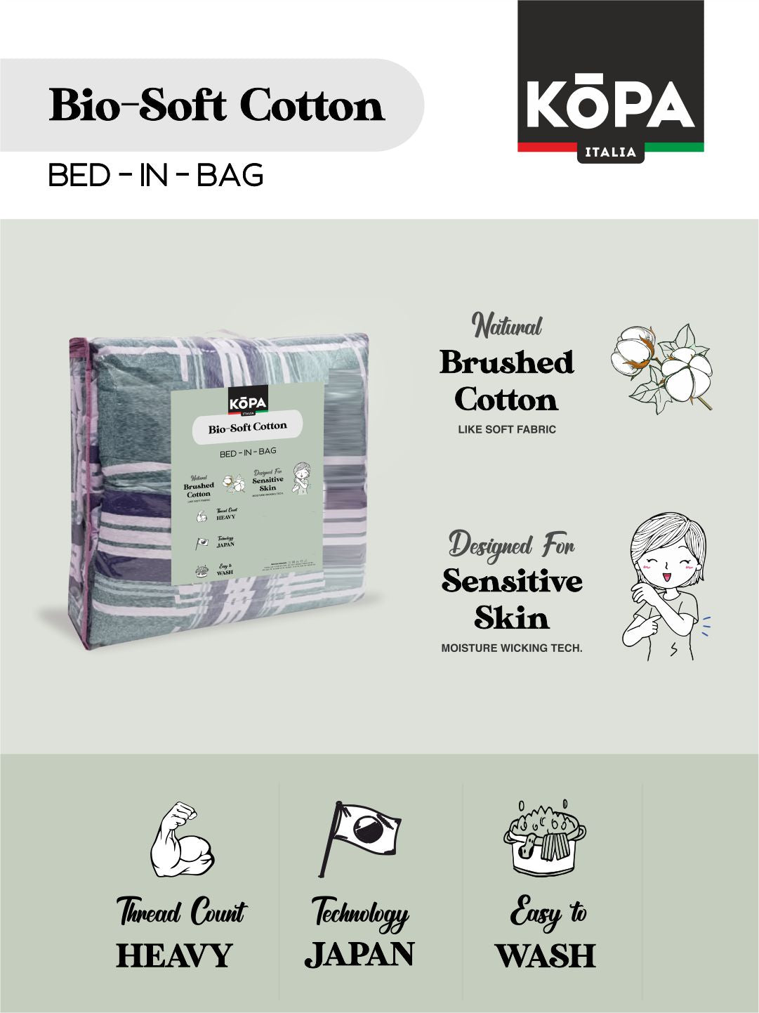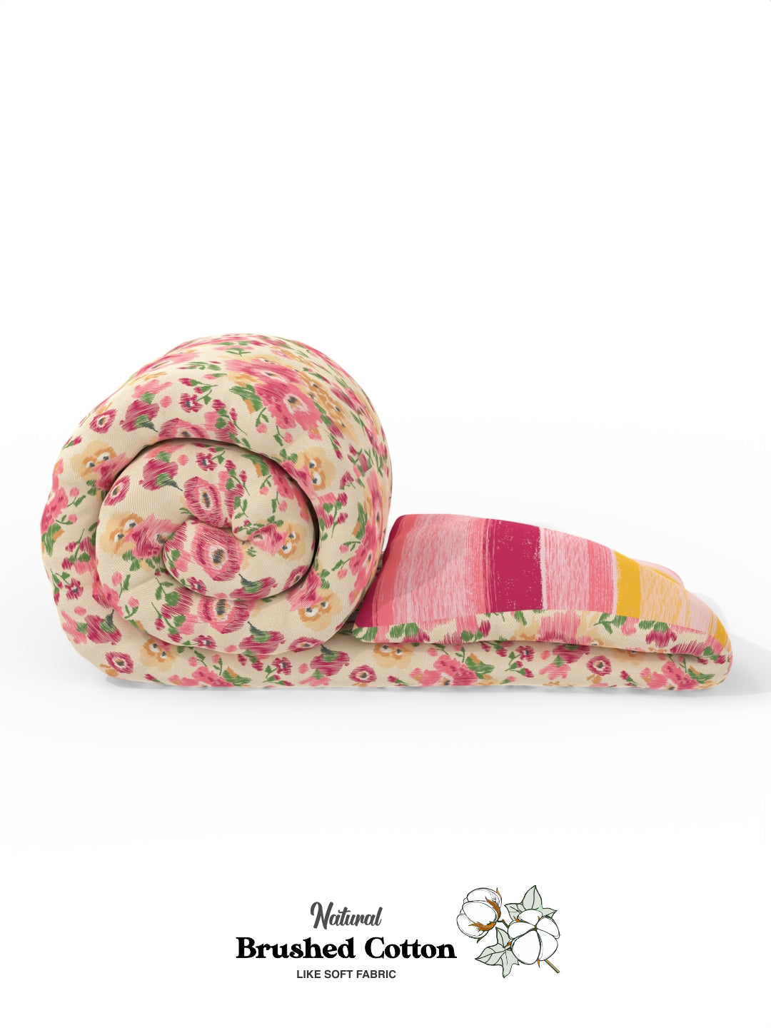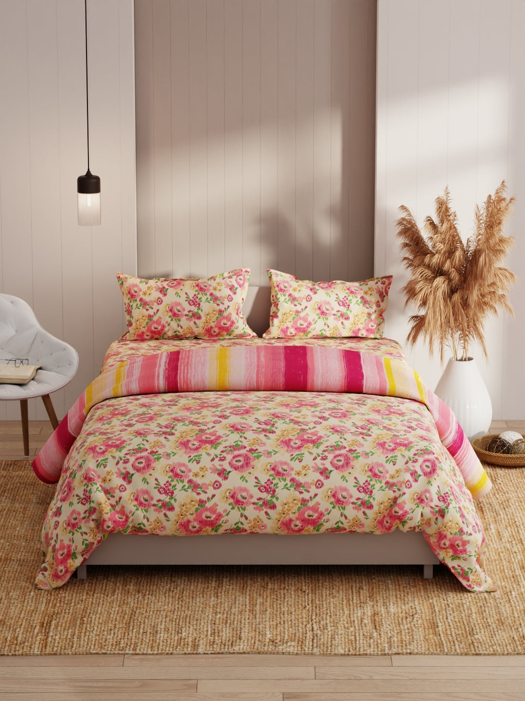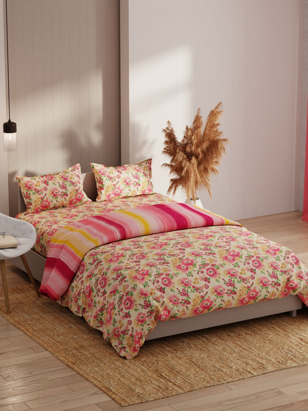 This king-size bed-in-bag set comes with one double dohar, one double bedsheet, and two pillow covers. It features a heavy-duty micro fabric for pleasant sleep. The comforter is filled with silken microfiber and is suited for an A/C room. The fabric has a special cotton-feel soft finish. It is easily machine washable.
