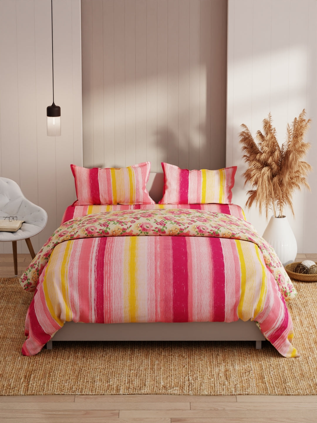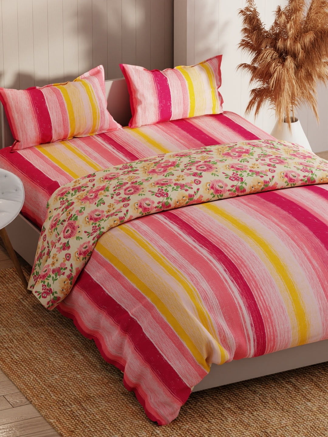 This king-size bed-in-bag set comes with one double dohar, one double bedsheet, and two pillow covers. It features a heavy-duty micro fabric for pleasant sleep. The comforter is filled with silken microfiber and is suited for an A/C room. The fabric has a special cotton-feel soft finish. It is easily machine washable.