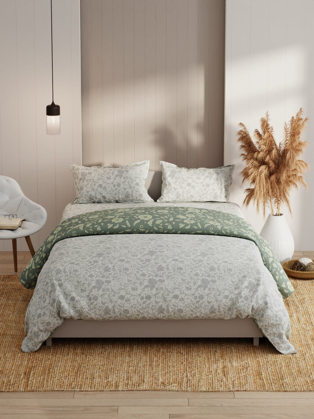 This king-size bed-in-bag set comes with one double dohar, one double bedsheet, and two pillow covers. It features a heavy-duty micro fabric for pleasant sleep. The comforter is filled with silken microfiber and is suited for an A/C room. The fabric has a special cotton-feel soft finish. It is easily machine washable.