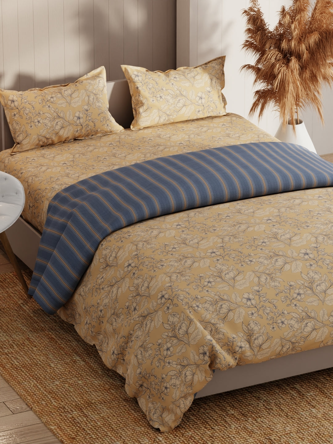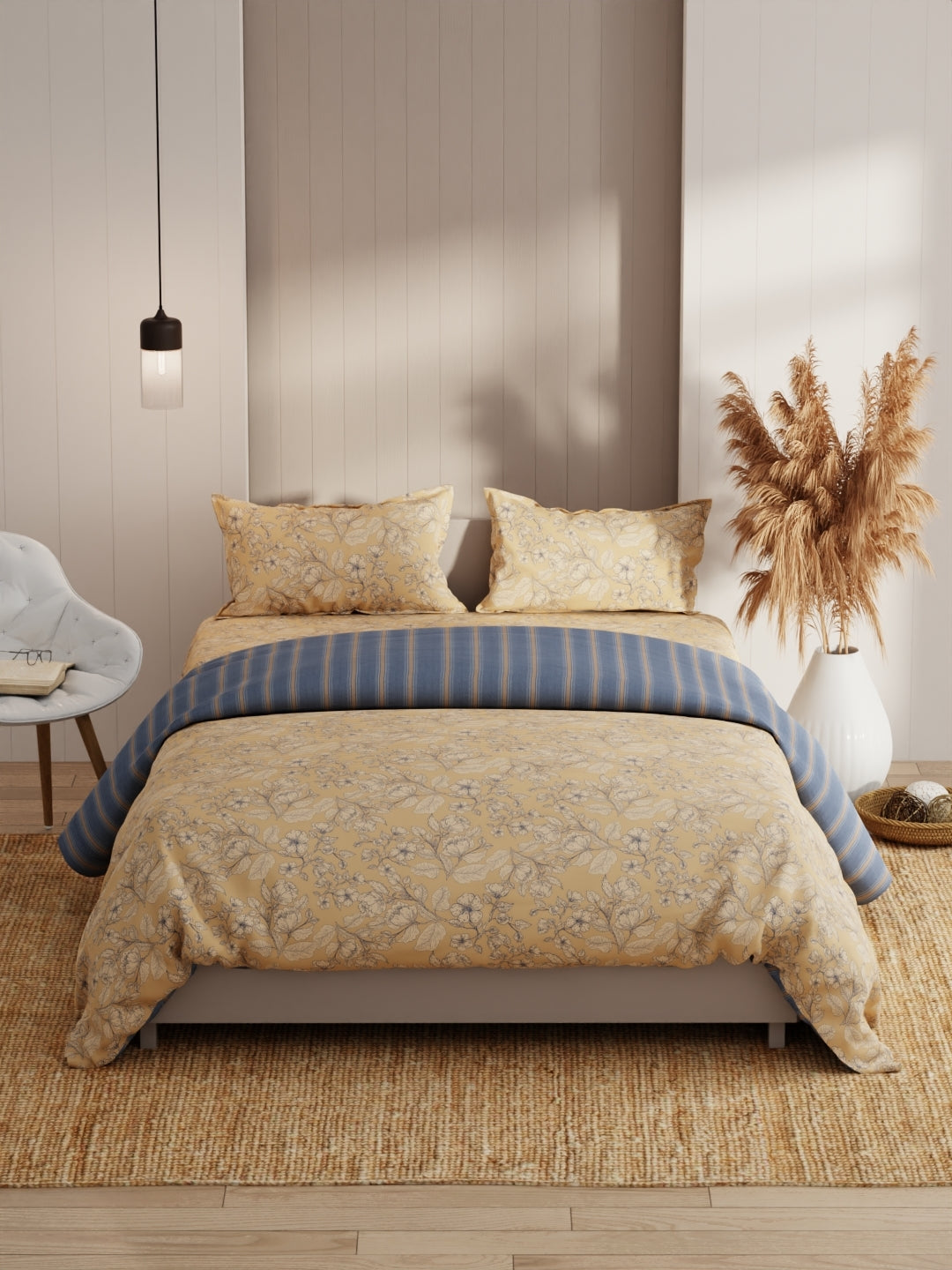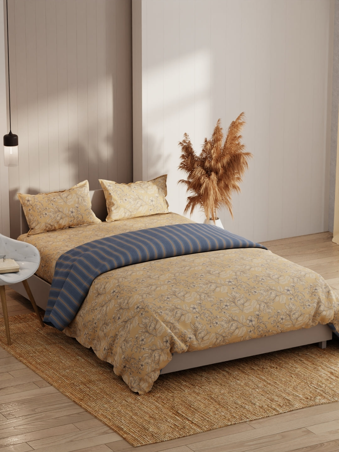 This king-size bed-in-bag set comes with one double dohar, one double bedsheet, and two pillow covers. It features a heavy-duty micro fabric for pleasant sleep. The comforter is filled with silken microfiber and is suited for an A/C room. The fabric has a special cotton-feel soft finish. It is easily machine washable.