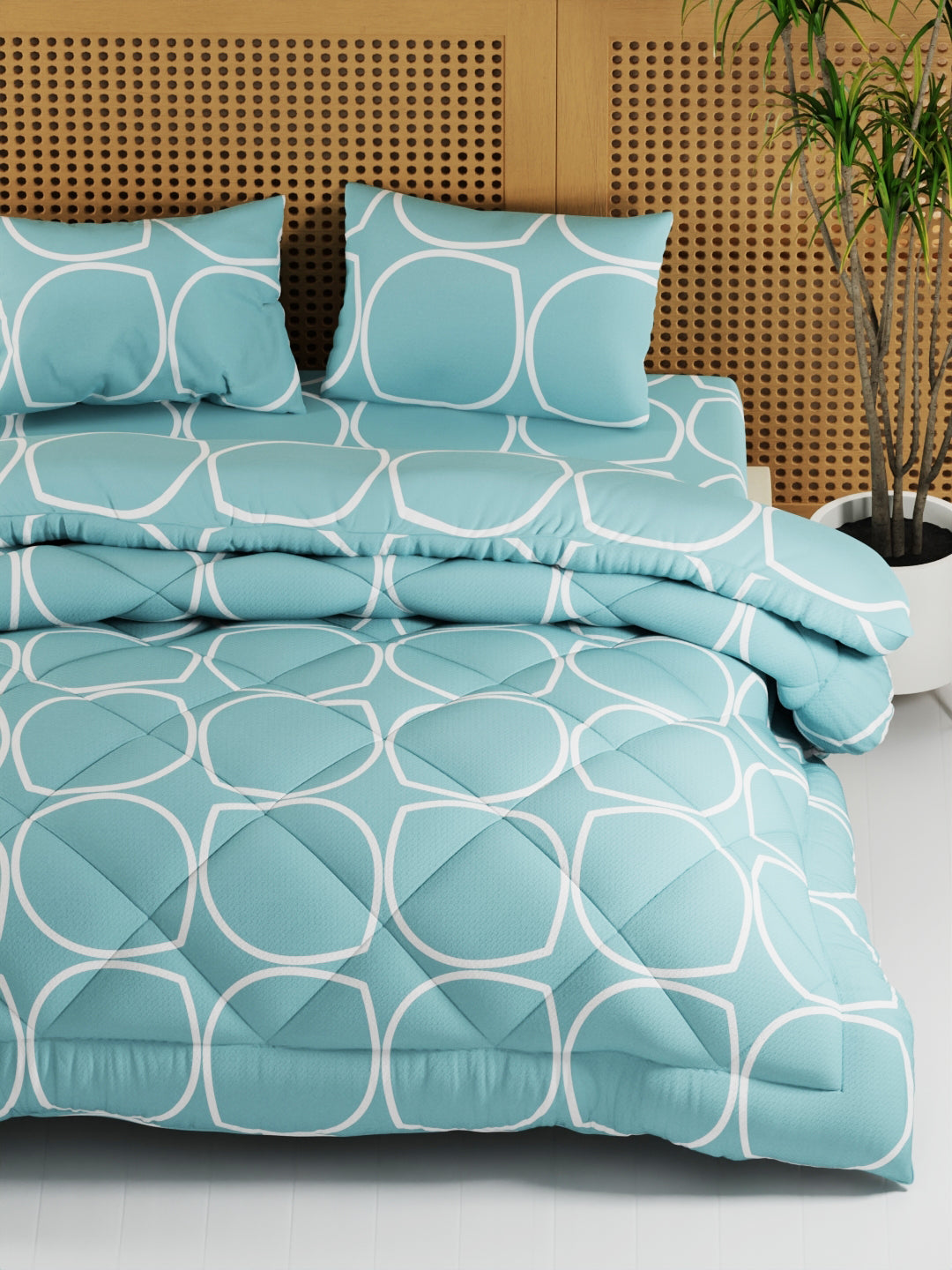 Experience ultimate comfort and style with the Kopa California Bed-in-Bag. Made from premium microfiber fabric and treated with a brushed finish, it provides a soft cotton feel and a cozy touch. The precision stitch and long-lasting material ensure durability and zero color fading. This bedsheet set fits 6-inch mattresses. These comforters are suitable for use in AC rooms and in all seasons. Soft to the skin and easy to care for, this bedsheet is a must-have for your bedroom decor. It offers a cozy and luxurious feel. The modern print adds a touch of elegance to your bedroom. This set comes with two matching pillow covers and is easily machine washable for convenient handling.