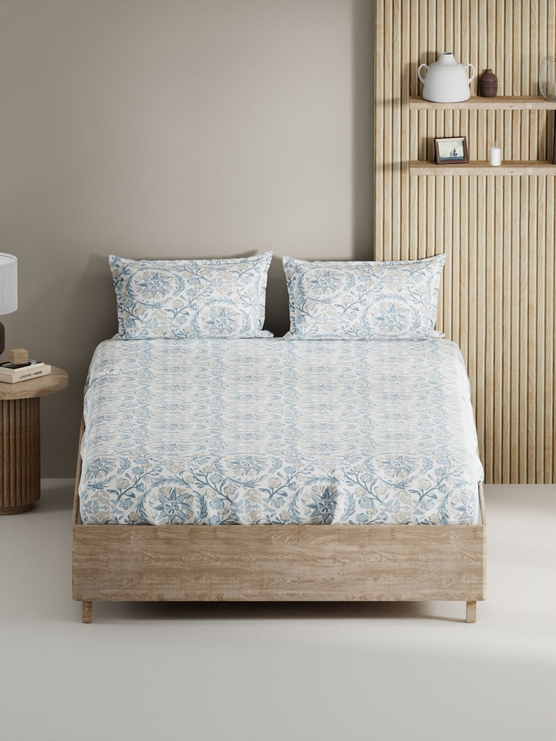 enhance the beauty of your bed room interiors with this 100% cotton, 144tc percale double bedsheet. it's extremely comfortable and super soft to touch. recommended for delicate skin to avoid any rashes. it will comfortably fit your double size mattress. it includes two pillow covers. machine washable and easy to maintain.