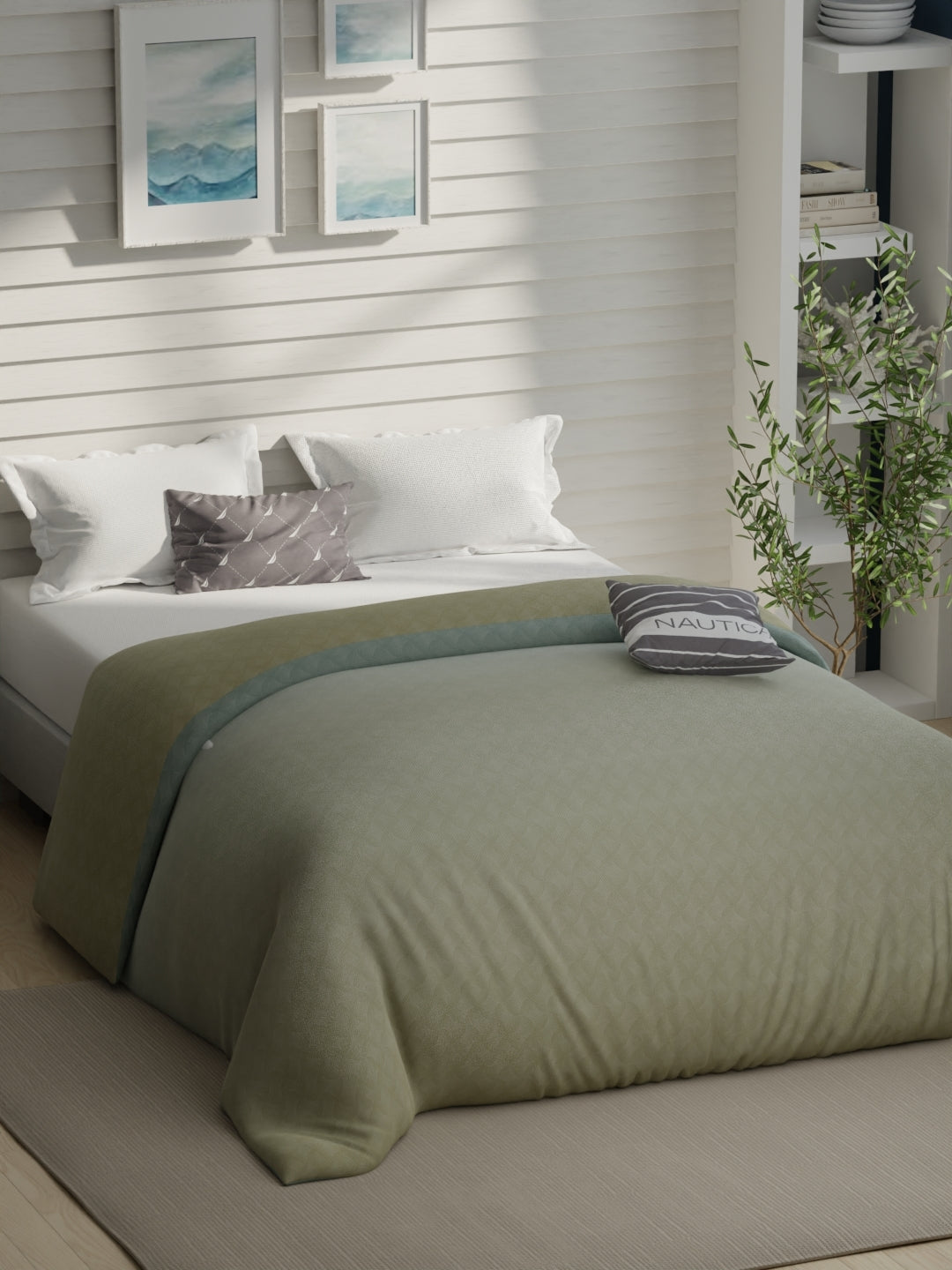 Nautica Fairwater comforters are trendsetters and can transform your space completely. This fashionable comforter is made with aloe vera gel fiber filling of 130 gsm, making it temperature controlled as per your body temperature. Its outer shell is made of high thread count 160 TC 100% premium cotton fabric, which gives you the softest feeling. It has a special dustproof layer, which helps to keep you and your loved one safe. These comforters are suitable for use in AC rooms and in all seasons. It will keep you warm and cozy-feeling. It features the quality stitch and beautiful quilted pattern. Elegant prints do not fade away even after daily use. This comforter gets softer with every wash. It's machine washable and easy to maintain.