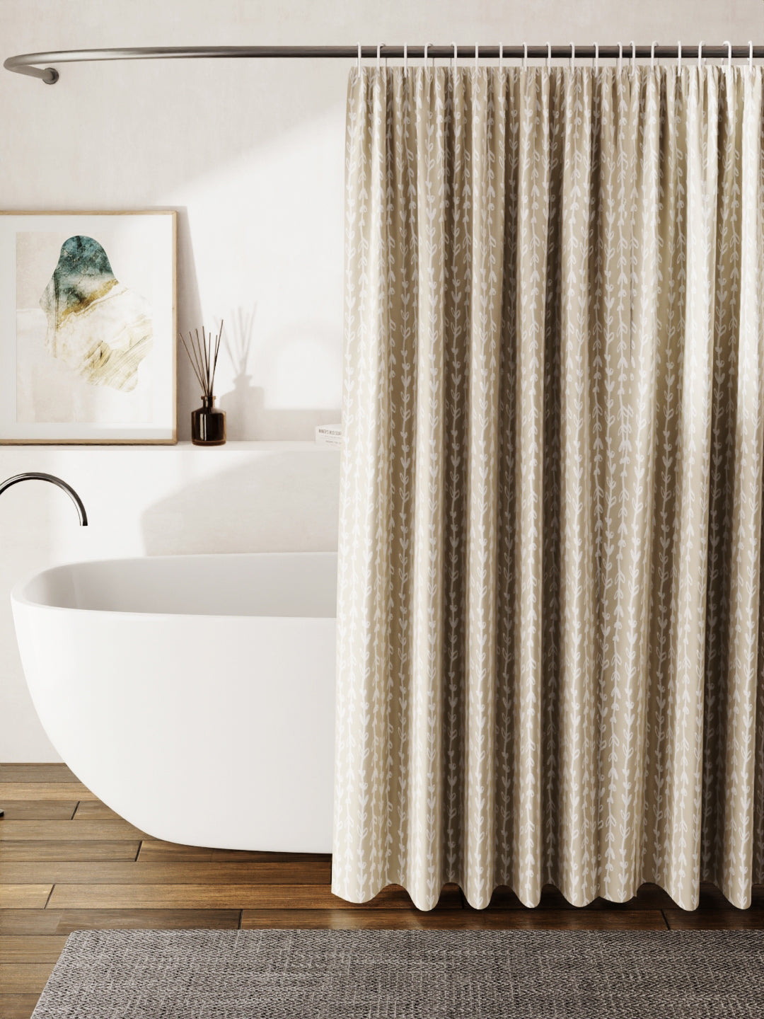 Enjoy a hot shower while hiding yourself behind this printed-fabric shower curtain. This contemporary shower curtain is ideal for all modern-day homes. The fabric is breathable but waterproof. It will not stick to your skin. It comes with 12 plastic C-shaped hooks and is kid-friendly.