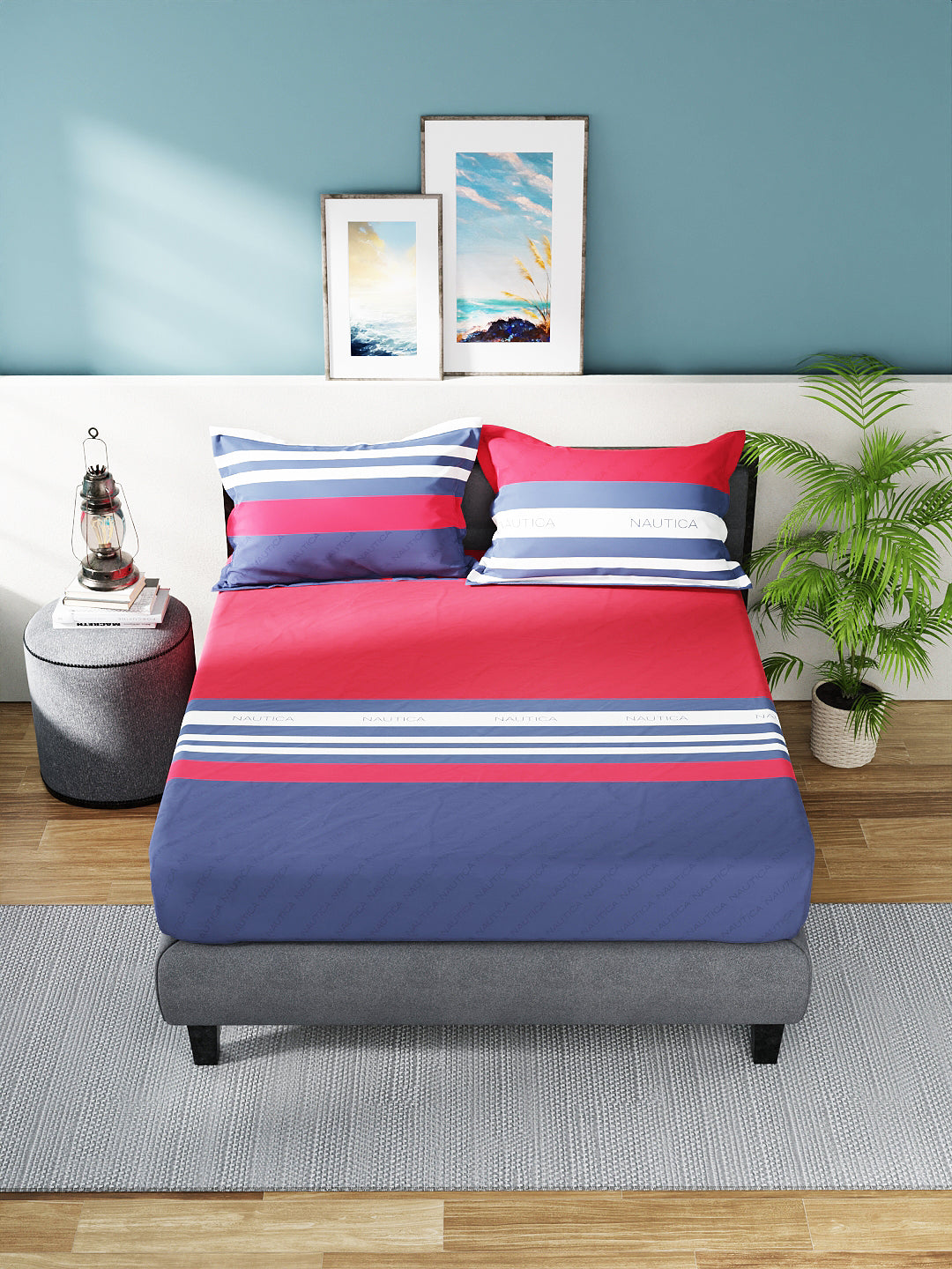 Super Soft 100% Cotton King Bedsheet With 2 Pillow Covers (stripe-rose/indigo)